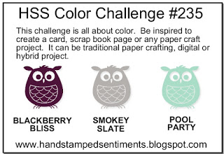 It's a smokin' color challenge from Hand Stamped Sentiments! For my spin on the challenge I have taken the liberty to add Gold Glimmer to tie it all together. I started with some Flower Flair cutouts and then I watercolored them. Once dry I detailed them with a black marker and then stamped the "hello" images which come from the set Memories in the Making. The pieces are all laid out on a piece of Shine On DSP.