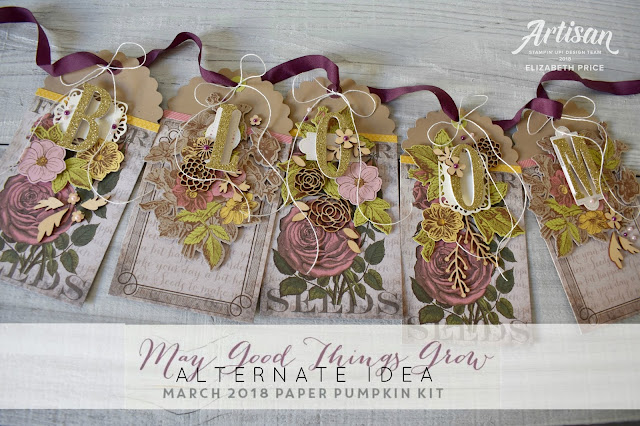 For this hop I sat down with my March Paper Pumpkin Kit to make a little something pretty. The beauty of the florals and colors in the kit were PERFECT for our creating for the garden party theme. I chose to make an alternate projects using supplies from the May Good Things Grow Kit. The only added supplies I used to complete my "bloom" garland were the Large Letter Framelits and Gold Glimmer Paper.